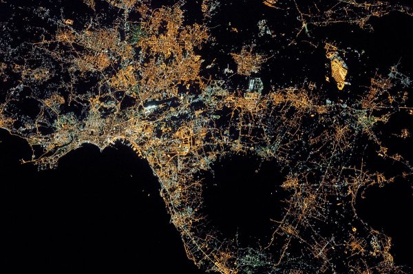 Итальянские Неаполь и Везувий ночью. Неаполь и его окрестности — один из самых ярких регионов Италии, здесь живет около трех миллионов человек. Зеленые огни — это старомодные ртутные газоразрядные лампы. В новых районах их сменили натриевые газоразрядные лампы (желто-оранжевые огоньки). Яркое пятно на северо-востоке — это крупнейший в Европе торговый центр, а темный круг на юге — вулкан Везувий.