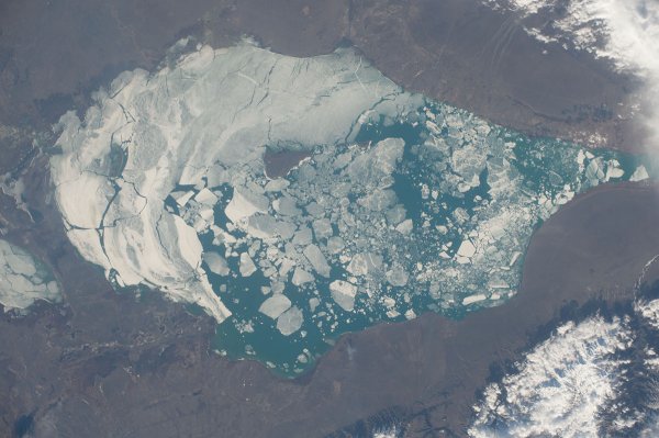 Затянутое льдом озеро Алаколь в Казахстане. Озеро расположено в перевале Джунгарские Ворота, который соединяет Китай с Центральной Азией.