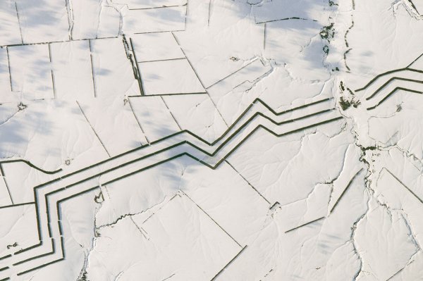 Заснеженная степь в России. На фото виден 14-километровый участок системы для защиты почв от ветровой эрозии. Каждая из линий — это плотная «стена» деревьев шириной около 60 метров.