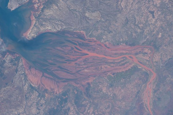 Устье реки Бецибука на Мадагаскаре. Ее красно-коричневый цвет является признаком экологической катастрофы. Из-за вырубок леса и освоения земель под пашни и пастбища река вымывает огромное количество красных латеритных почв, которые оседают в устье.