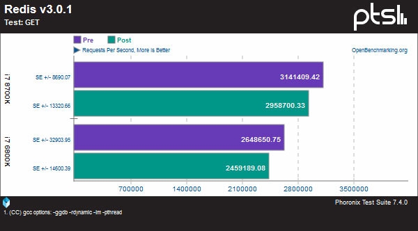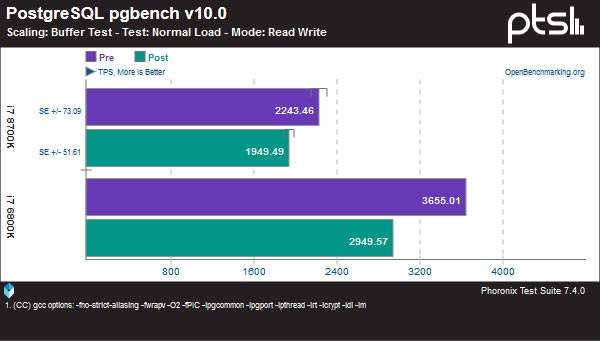 Тестированию в синтетических пакетах подверглись две системы: на базе Core i7 8700K Coffee Lake с Ubuntu 16.04.3 LTS и Core i7 6800K Broadwell E с Ubuntu 17.10. Компоненты тоже отличались, так что корректнее сравнивать результаты отдельного процессора с активированной заплаткой и без неё.