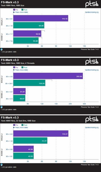 Производительность обеих систем в тесте Compile Bench тоже пострадала. Если это не вызвано x86-заплатками, то в свежее ядро должны были быть внесены другие существенные регрессивные изменения (что весьма сомнительно).