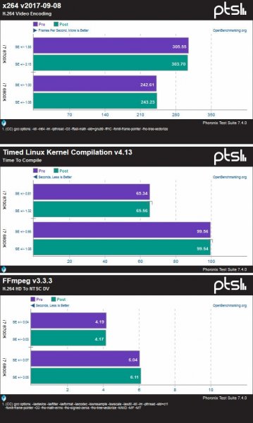 В то же время скорость работы приложений, ограниченных при работе преимущественно активностью в области пользовательского пространства, будет затронута, по-видимому, минимально, если судить по тестам кодирования видео в формат H.264, задаче компиляции и декодирования видео через FFmpeg: