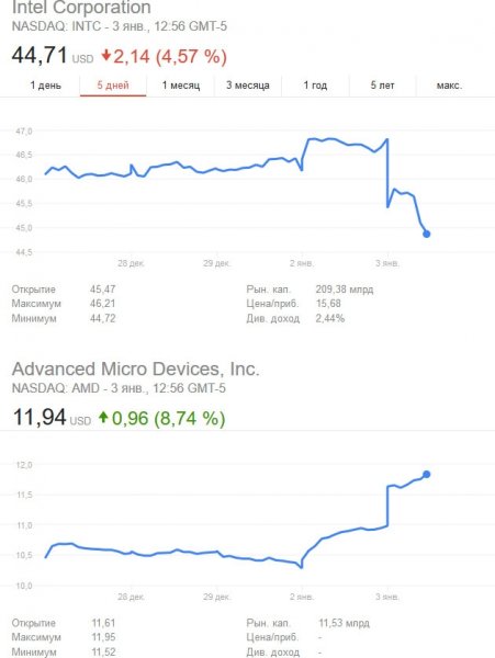 Между тем AMD в лице Томаса Лендаки (Thomas Lendacky) официально подтвердила, что её чипы не подвержены уязвимости: «Процессоры AMD не являются объектом тех типов атак, против которых направлены меры защиты KTPI. Микроархитектура AMD не разрешает ссылки на ячейки памяти, в том числе спекулятивные, которые дают доступ к высокопривилегированным данным в менее привилегированном режиме, когда такой доступ может приводить к ошибке страницы. Поэтому следует по стандарту отключать KPTI на процессорах AMD». Обсуждение новости уже привело к падению курса акций Intel и росту AMD.