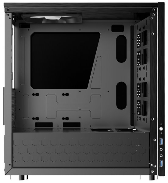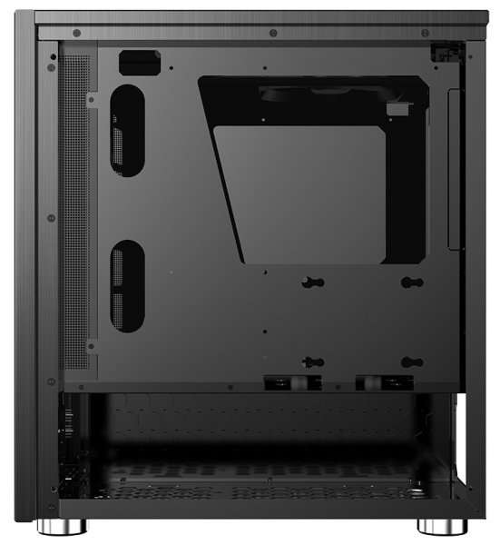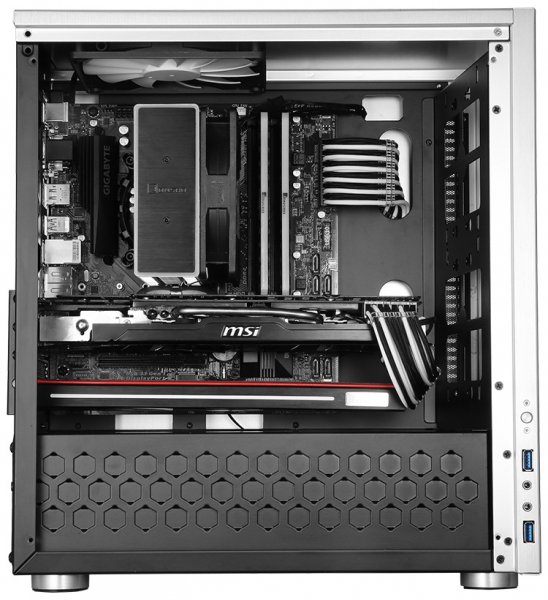 Внутреннее пространство разделено на два отсека: внизу находятся посадочные места для блока питания и части накопителей, а над кожухом БП можно закрепить остальные комплектующие, в том числе два HDD/SSD на самом кожухе (под видеокартами).