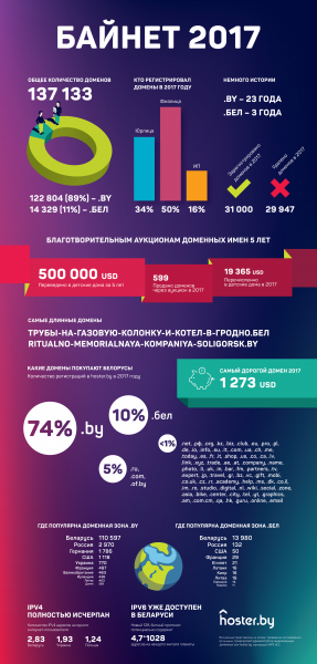 Белорусские домены очень неплохо чувствовали себя в этом году. Если к концу 2016 г. байнет сократился почти на 1700 имен, то в 2017 г. вышел «в плюс». За последние 12 месяцев было зарегистрировано более 31?000 новых доменов .BY и .БЕЛ. Об этом рассказали представители hoster.by — одного из крупнейших облачных хостинг-провайдеров, технического администратора и регистратора национальных доменных зон.