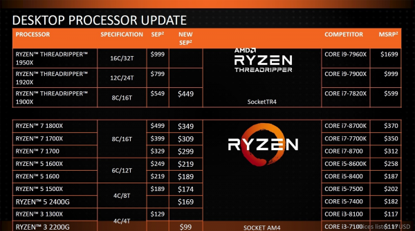 Мы уже наблюдали, как процессоры Ryzen продавались существенно дешевле установленных в официальном прайс-листе цен. В частности, большие скидки AMD предлагала в «чёрную пятницу», когда цена Ryzen Threadripper 1950X, например, падала до $800, а Ryzen 7 1800X дешевел до $320. Теперь же более низкие цены обрели постоянный и официальный статус. Вместе с разблокированными множителями и доступностью недорогих материнских плат цены должны стать ещё одним аргументом для покупателей в пользу приобретения идеологически правильных процессоров семейства Ryzen, а не каких-нибудь там Intel Coffee Lake.