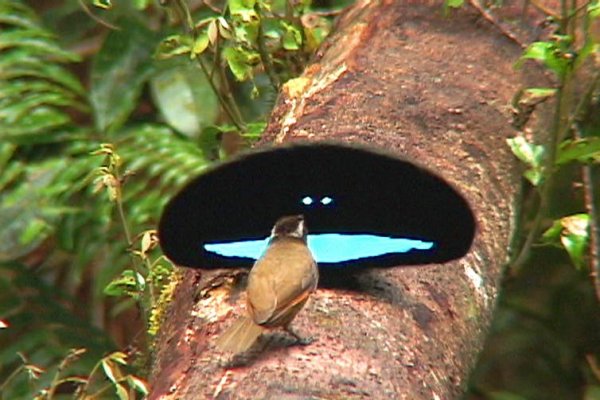 Ученые полагают, что такое оперение помогает самцам выглядеть более привлекательными для самок. Во время брачных игр самцы распускают свои перья так, чтобы самка увидела огромную черную плоскость. На таком темном фоне цветные пятна кажутся гораздо ярче. Так как самки выбирают самых заметных партнеров, по наследству передаются как гены ярких пятен, так и гены «суперчерного» фона.