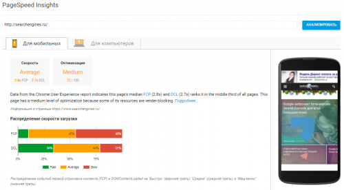 Для сайта Searchengines.ru обновленный сервис Google PageSpeed Insights выдал приведенный ниже результат: