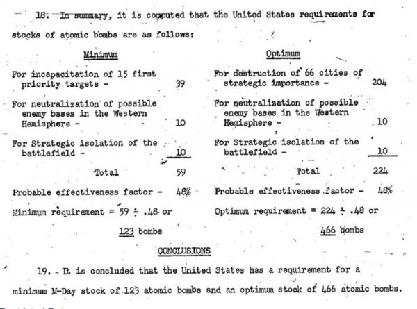 В Пентагоне считали, что для стирания СССР с карты мира достаточно 204 атомных бомб. Но «оптимальным» считалось сбросить на советское государство 466 атомных бомб.