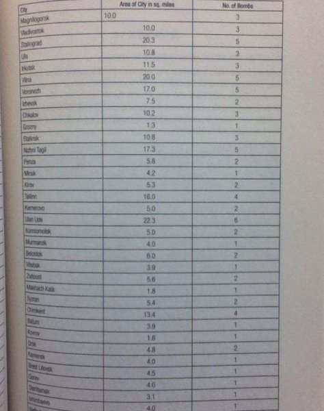 На сайте был опубликован документ, с которого сняли гриф секретности. Список самых крупных городов СССР насчитывал 66 стратегических целей. Американцы посчитали площадь каждого города и количество бомб, необходимых на его уничтожение. Например, на Минск отводилась одна атомная бомба, на Москву планировали сбросить шесть бомб и столько же — на Киев.