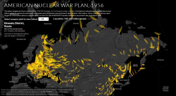 По одному из американских планов нападения на СССР, уничтожению подлежали 1154 цели, в том числе на территории стран-союзниц. Опираясь на данные, рассекреченные Национальным управлением архивов и документации США два года назад, американский физик Макс Тэгмарк и историк Алекс Валлерштайн создали интерактивную карту, позволяющую оценить последствия атомной бомбардировки.
