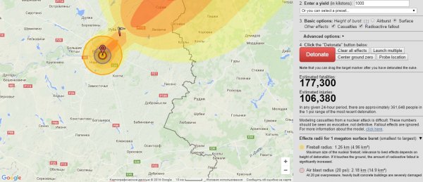 Пользователи могут выбрать мощность ядерного заряда в промежутке от 50 Кт до 10 Мт и оценить масштабы радиоактивного загрязнения и жертв. Например, при ударе по Полоцку боеголовкой мощностью 1Мт 53,2 тысячи человек погибли бы, а 38,3 тысячи получили бы ранения различной степени тяжести.