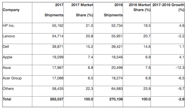 В Gartner подсчитали, что в октябре–декабре 2017 года производители выпустили в общей сложности 71,6 млн персональных компьютеров, что на 2 % меньше аналогичного периода 2016-го. За весь прошлый год было отгружено 262,5 млн систем, что почти на 3 % меньше показателя годичной давности. На долю четырёх крупнейших производителей — HP Inc., Lenovo, Dell и Apple — пришлось около 64 % годовых продаж оборудования.