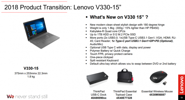 Одним из первых в 2018 году вышел 15,6-дюймовый ноутбук ThinkPad V330-15, но пока он доступен только в отдельных регионах, в частности в Гонконге. Данная модель упоминается в документе, благодаря которому стало известно о планах Lenovo по выпуску вышеперечисленных ThinkPad на основе Ryzen и шестиядерных Core.