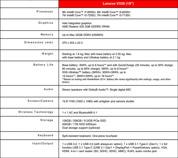 В другие регионы Lenovo будет отгружать модели ThinkPad V330-15 в том числе и с дискретным графическим адаптером Radeon 530 2GB GDDR5. В числе опциональных узлов упоминаются двухъядерные процессоры Core i3-7130U и Core i5-7200U, аккумуляторные батареи номиналом от 30 Вт·ч до «39 + 39» Вт·ч (от 6 до 16 часов автономной работы) и 512-гигабайтный M.2 SSD. Весит ноутбук, в зависимости от «начинки», от 1,8 до 2,1 кг. Корпус у устройства один, размером 375 ? 253 ? 22,3 мм.