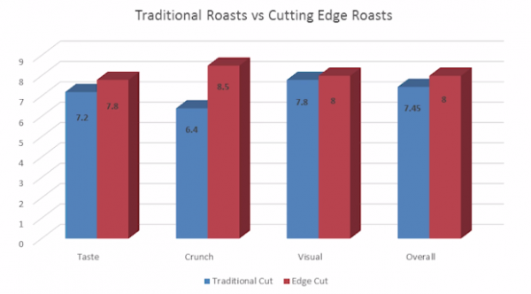 Оказалось, что картофель, порезанный методом edge cut, больше пришелся по душе как общей аудитории, так и поварам. Авторы сообщают, что согласно опросу, показатели качества улучшились на 46,5 процента по сравнению с оригинальным рецептом Блюменталя, хотя из представленного графика непонятно, как именно рассчитывалось это значение.