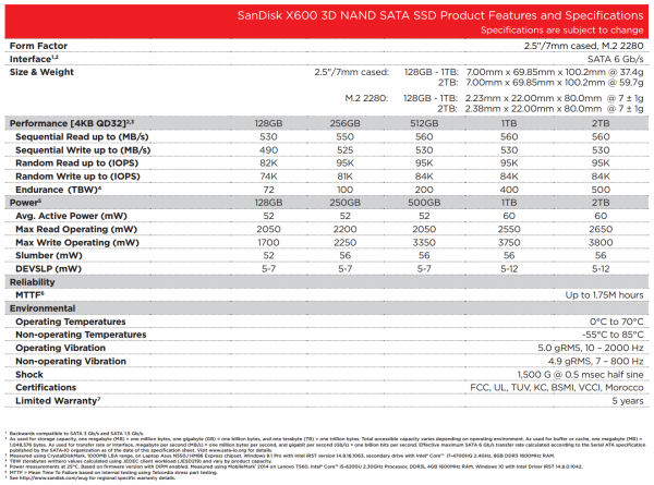 Принадлежащая корпорации Western Digital компания SanDisk анонсировала дебют на рынке новой серии твердотельных накопителей с лаконичным названием X600. Устройства объёмом 128, 256 и 512 Гбайт, а также 1 и 2 Тбайт, имеют два варианта исполнения — 2,5 дюйма/7 мм и M.2 2280. Несмотря на внешние различия, прикладные характеристики моделей одного объёма совпадают. В новых накопителях SanDisk X-серии используются интерфейс SATA 6 Гбит/с, неназванный контроллер (предположительно, производства Marvell) и 64-слойная флеш-память Western Digital 3D TLC NAND.