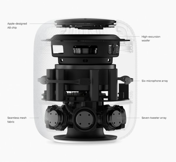 Apple описала колонку стоимостью $349 как «новый волшебный музыкальный опыт», который совмещает высококачественный звук и возможности голосового управления Siri. Устройство высотой 17,2 см оснащено одним сабвуфером, семью высокочастотными динамиками и шестью микрофонами. В будущем HomePod можно будет комбинировать с ещё одной такой же колонкой для получения стереозвука.