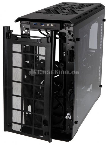 В комплект поставки модели Enthoo Evolv ATX Flow включены три 140-мм вентилятора Phanteks PH-F140SP (1200 об/мин, 19 дБА). На панели ввода-вывода в передней части корпуса находятся два порта USB 3.0, гнёзда для наушников и микрофона.
