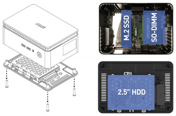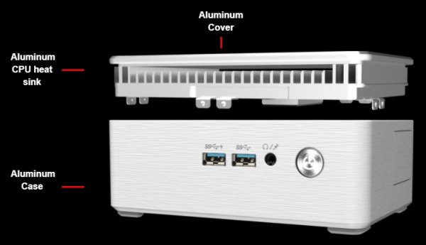 В состав barebone-версий входят следующие узлы: корпус, материнская плата с распаянным на ней 15-Вт SoC Intel Kaby Lake-U, кулер, беспроводной адаптер Wi-Fi/Bluetooth, внешний блок питания номиналом 65 Вт и крепление VESA 75 ? 75/100 ? 100 мм. Версии, относящиеся к категории мини-ПК, дополнительно оснащены модулем(-ями) оперативной памяти и «загрузочным» SSD-накопителем. В отдельных сборках также присутствует жёсткий диск.