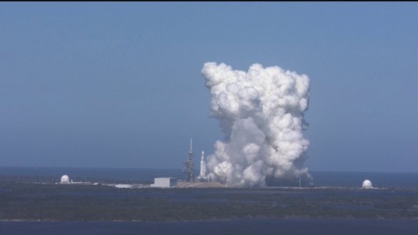 Ракета Falcon Heavy впервые прошла испытания в собранном виде. До этого, в мае прошлого года, были проведены статические огневые испытания основного центрального массива двигателей первой ступени Falcon Heavy.