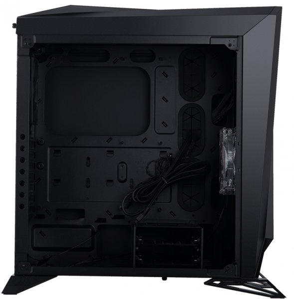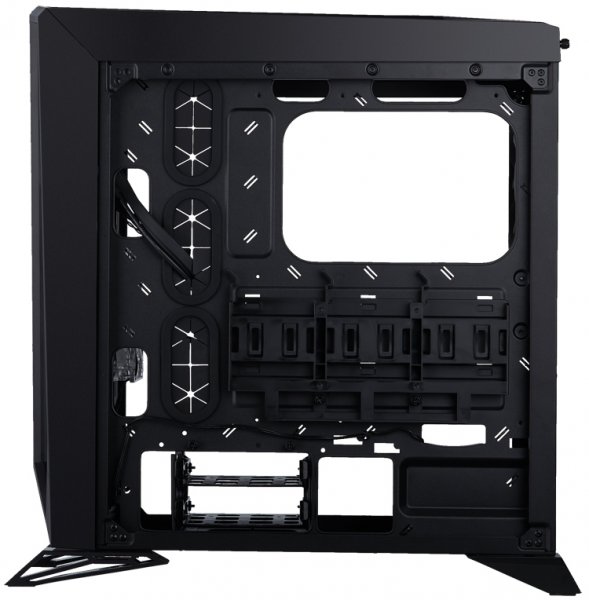 Новинка получила асимметричный геометрический дизайн. Боковая стенка и часть фронтальной панели выполнены из закалённого стекла, что позволяет любоваться установленными компонентами.