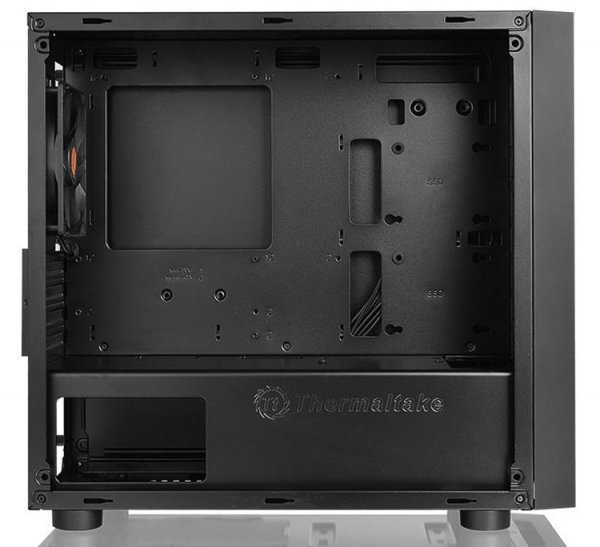 Пространство под кожухом, украшенным логотипом Thermaltake, предназначено для ATX-совместимого блока питания длиной до 220 мм и двух 3,5-дюймовых жёстких дисков.