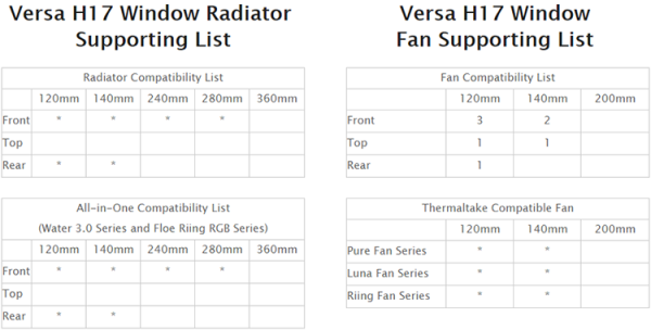 Помимо основной версии Thermaltake Versa H17 (артикул CA-1J1-00S1NN-00), в продажу также поступит модель с акриловым окном в боковой панели — Versa H17 Window (CA-1J1-00S1WN-00). Масса обоих вариантов корпуса приблизительно одинакова и равна 4,5 кг. Габариты скромнее, чем у средних Mid-Tower — особенно это касается длины и высоты конструкции, которые составляют 380 и 390 мм соответственно. По ширине Versa H17/H17 Window не уступает многим бюджетным Mid-Tower корпусам (205 мм), хотя пространство для процессорного кулера всё-таки ограничено 155 миллиметрами.