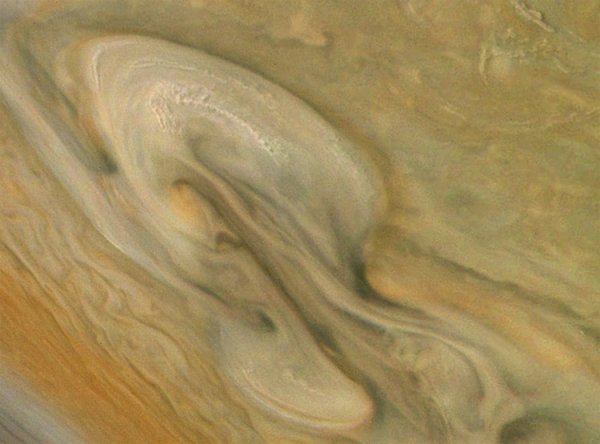 На изображении показана северная полярная область газового гиганта. «Юнона» смогла запечатлеть мощнейший шторм, который формирует причудливые фигуры в атмосфере планеты.