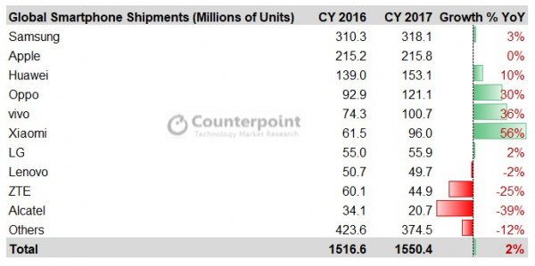 Аналитическая компания Counterpoint провела исследование и назвала крупнейших мировых производителей смартфонов за четвертый квартал 2017 года и весь прошедший год. Об этом сообщает PhoneArena.