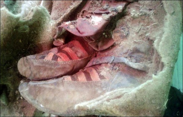 Позже ученые объяснили, что на ногах у нее не кроссовки, а высокие кожаные сапоги с красно-черными полосами. Она жила в десятом веке нашей эры, скорее всего, была знатной и богатой особой, а скончалась от черепно-мозговой травмы.