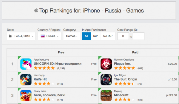В России — соответственно, первую и восьмую позицию (опережая официальное приложение «ВКонтакте»). В Беларуси UNICORN 3D расположилось на первом месте среди бесплатных игр и на 9-м среди всего топа бесплатных программ.