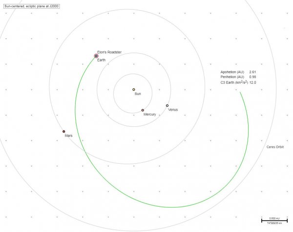 Автомобиль Tesla должен был быть запущен на эллиптическую орбиту, протягивающуюся от Солнца до Марса. По плану он должен был удалиться от Земли примерно на 400 миллионов километров и лететь со скоростью 11 километров в секунду.
