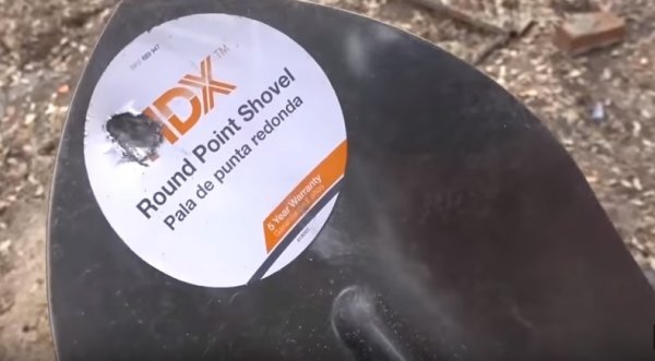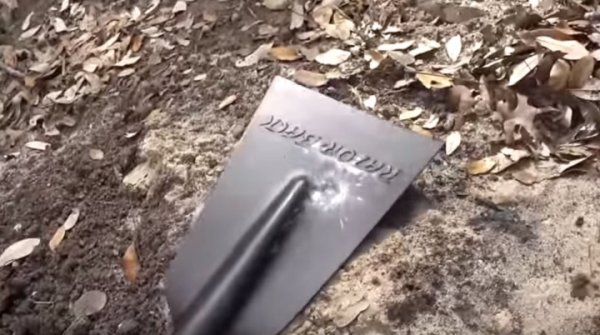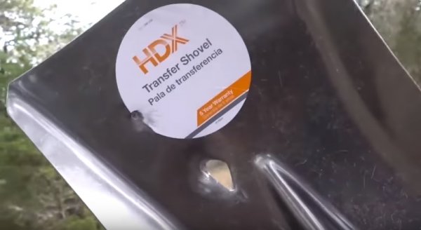 Дальше черед настал подборочной лопаты, сделанной из стали. Стрельба велась также из пистолета калибра .22LR. Результат обнадежил: пуля пробить лопату не смогла.