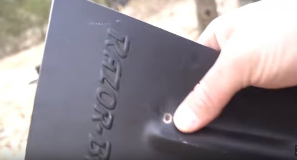 На этом эксперимент не закончился, у Мэтта в запасе была еще дренажная лопата. Однако и ей не удалось противостоять скоростному боеприпасу. Дальше автор взялся за скребок, и он без труда остановил пулю Liberty civil defense.