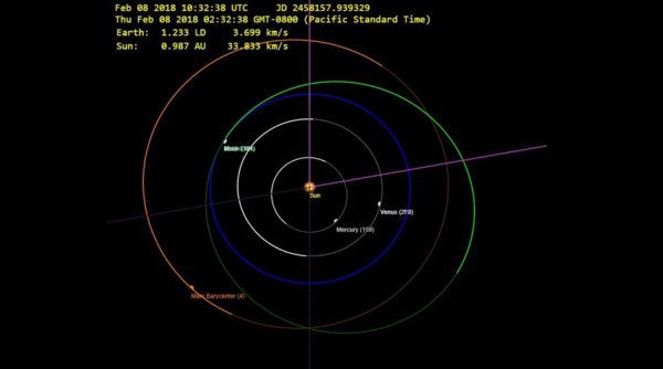 «Многие почему-то ошибочно думали, что автомобиль должен столкнуться с Марсом. Планировалось, что точка максимального удаления будет лежать внутри пояса астероидов. В реальности оказалось, что орбита не столь сильно вытянута и дальняя точка почти на одну астрономическую единицу ближе, чем Главный пояс астероидов, где-то между Марсом и Церерой, — пояснил «Газете.Ru» российский астроном Станислав Короткий, администратор сообщества AstroAlert.