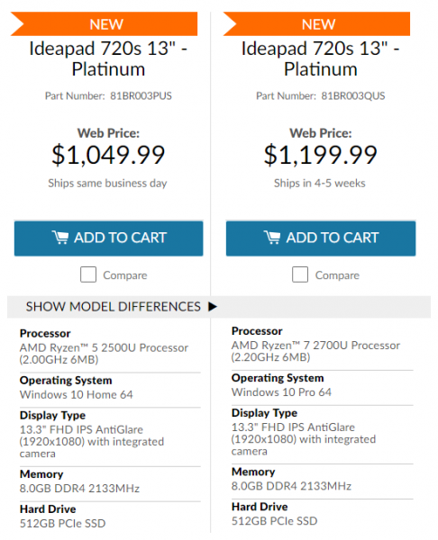 Продукт с артикулом 81BR000XGE на днях появился в прайс-листах ряда немецких и австрийских интернет-магазинов. Демократичной минимальную цену в €999 не назовёшь, но, с другой стороны, и версия Ideapad 720S, оснащённая APU Ryzen 5 2500U, не намного дешевле — €899. Сравнивая Ryzen 7 2700U с его «младшим братом», отметим ~10 % превосходство флагмана в задачах, полагающихся на производительность x86-ядер. Разницу в быстродействии графических ядер Radeon RX Vega 10 (Ryzen 7 2700U) и Radeon RX Vega 8 (Ryzen 5 2500U) пока оценивать сложно ввиду отсутствия достаточного количества результатов тестирования более «шустрого» чипа.