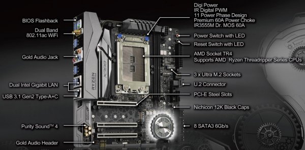 Размещение узлов 11-фазной системы питания гнезда TR4 на небольшом участке текстолита было нетривиальной задачей. Для минимизации токов утечки в ASRock прибегли к 8-слойной PCB и разделению силовых узлов на группы. Дополнительные разъёмы питания, отвечающие за подачу мощности к гнезду TR4, распаяны с разных сторон: ATX12V находится рядом с задней панелью I/O, а EPS12V — вблизи основного разъёма питания (ATX). Близкое соседство слотов для оперативной памяти DIMM DDR4 с процессорным гнездом ограничивает и без того скромный выбор систем охлаждения.