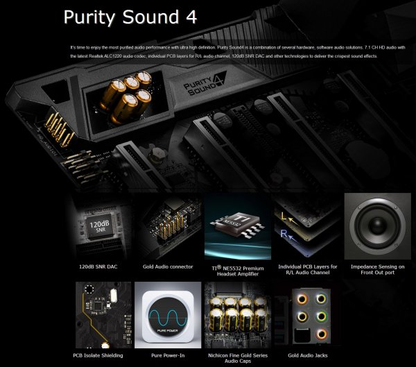 Новинка не обделена в том числе и сетевыми интерфейсами. Наряду с двумя разъёмами RJ-45 (на контроллерах Intel I211-AT) на задней панели, также доступен встроенный адаптер Wi-Fi (802.11ac)/Bluetooth 4.2 с пропускной способностью до 433 Мбит/с. Аудиоподсистема Purity Sound 4 включает 8-канальный кодек Realtek ALC1220, ЦАП с соотношением сигнал/шум в 120 дБ, усилитель для наушников TI NE5532, изолированный звуковой тракт и «аудиоконденсаторы» Nichicon.