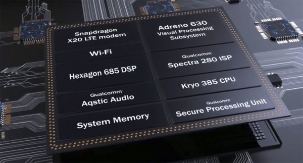 Вычислительную нагрузку возьмёт на себя мощный процессор Qualcomm Snapdragon 845, который содержит восемь ядер Kryo 385 с тактовой частотой до 2,8 ГГц, графический ускоритель Adreno 630, модуль обработки изображений Spectra 280 и сотовый модем Snapdragon X20 LTE.