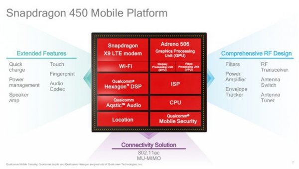 Размер и разрешение дисплея пока не уточняются. Но нужно отметить, что платформа Snapdragon 450 позволяет использовать экраны с разрешением до 1920 ? 1200 точек.