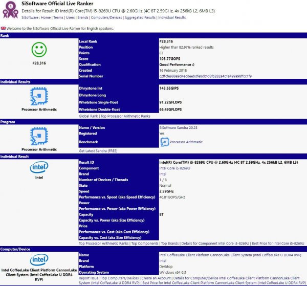 Недавно опытный образец Core i3-8121U был замечен в онлайн-базе тестового пакета Geekbench — он существенно обошёл по результатам современный Core i3-7100U. Но, похоже, Intel уже обкатывает на только 2-ядерные варианты чипов с архитектурой Cannon Lake, которые будут использовать её наиболее совершенные 10-нм технологические нормы полупроводникового производства: более совершенный чип был замечен в базе данных другого пакета SiSoftware Sandra.
