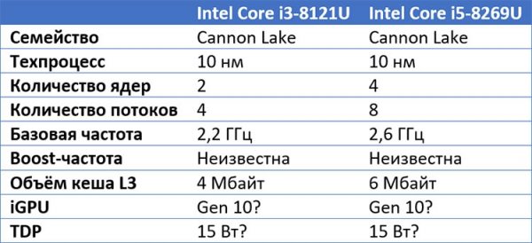 Деталей относительно Boost-частот нет, но по аналогии можно рассчитывать на преодоление отметки в 4 ГГц. Остальные характеристики соответствуют современным Core i5 U: 15-Вт TDP и 6 Мбайт кеш-памяти L3. Встроенная графика не упоминается, но процессоры Cannon Lake будут оснащаться интегрированными ускорителями Gen 10.