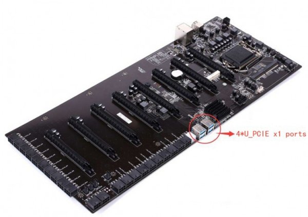Габариты материнской платы составляют 485 ? 195 мм. В общей сложности можно задействовать до двенадцати карт для майнинга. В частности, есть восемь слотов PCI Express 3.0 x16 (семь функционируют в режиме х1). Ещё четыре карты можно подключить при помощи PCI-E/USB-адаптеров.