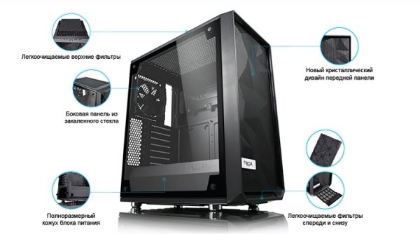 Утверждается, что корпуса серии Meshify выделяются агрессивным внешним видом и обеспечивают отличное охлаждение системы. Дизайн передней панели в виде угловатой сетки максимизирует забор воздуха.