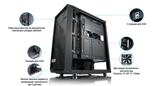 Предусмотрены посадочные места для семи вентиляторов. Можно задействовать жидкостную систему охлаждения с радиатором размером до 360 мм. Габариты корпусов — 409 ? 217 ? 453 мм с ножками и выступами.