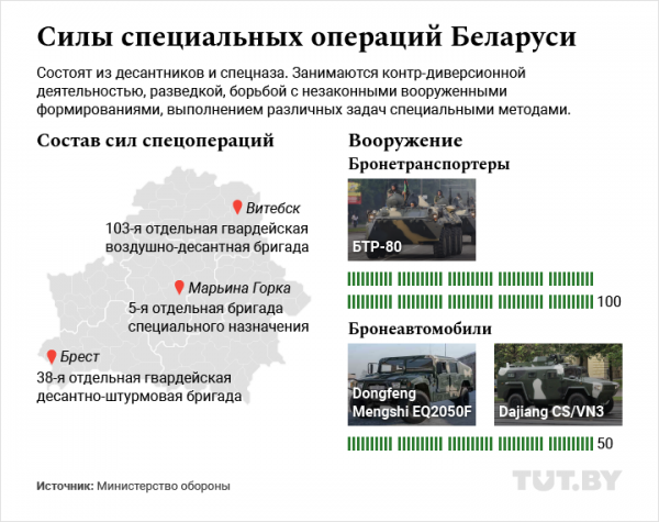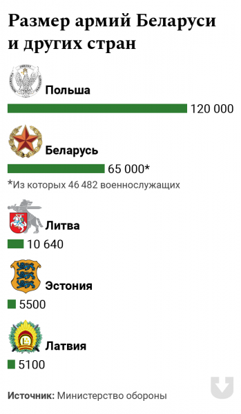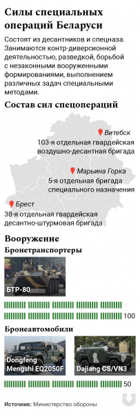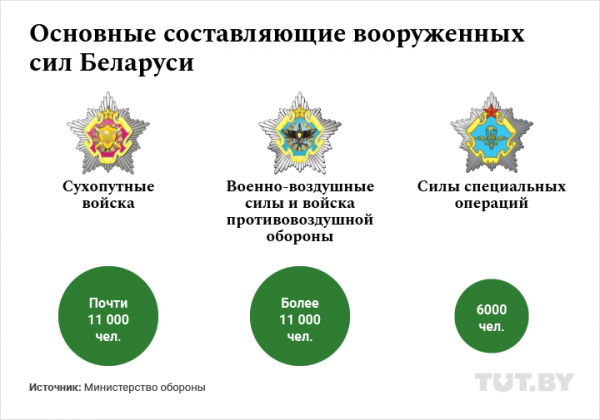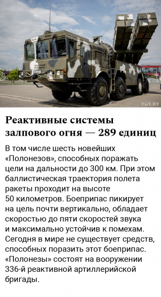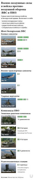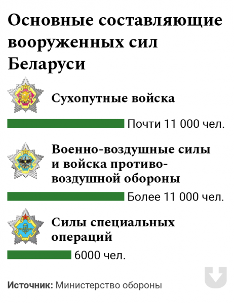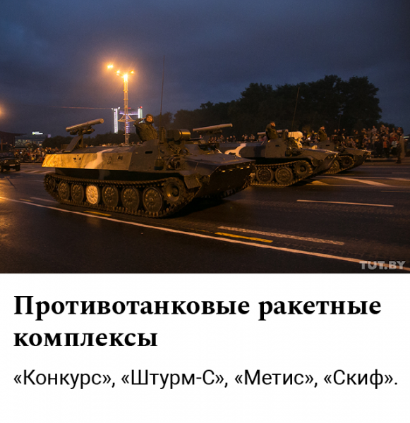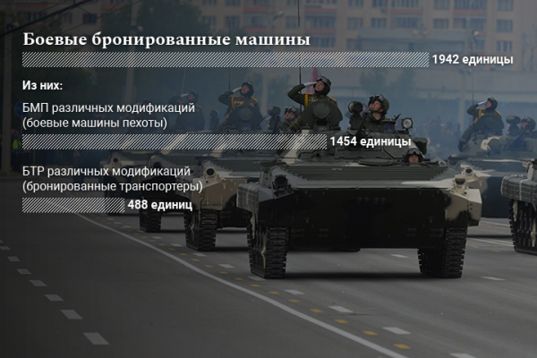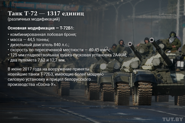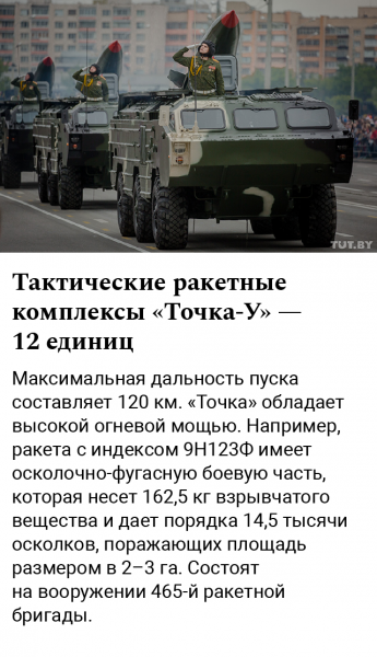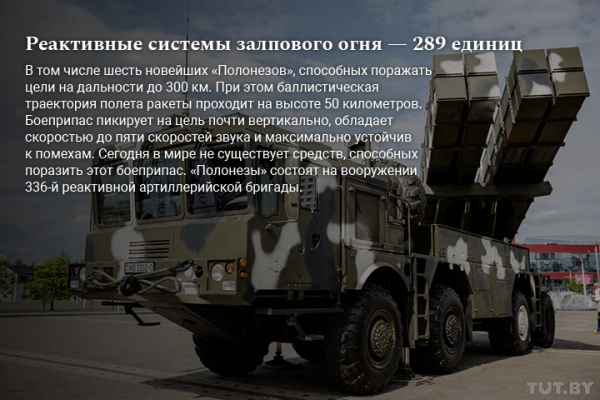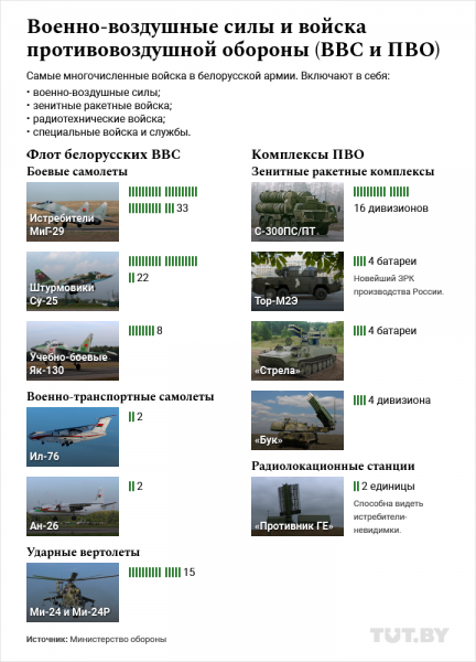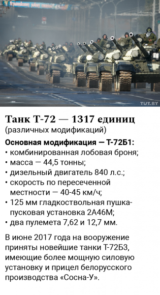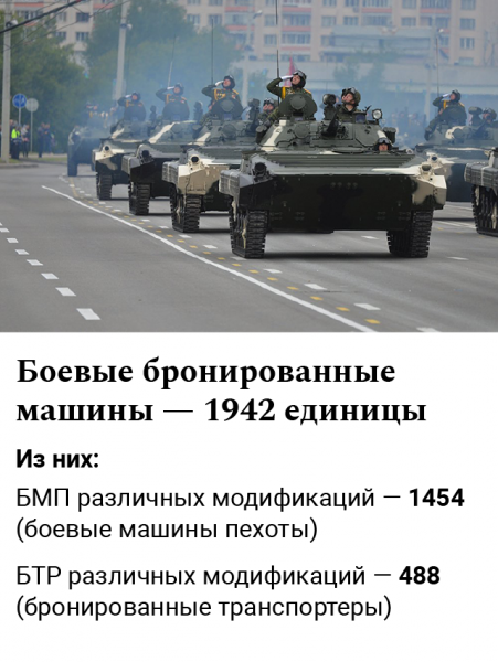 Белорусские войска укомплектованы ручным автоматическим стрелковым оружием и гранатометами (всего около полусотни образцов). Главную же ударную роль играет тяжелая бронетехника, артиллерия и авиация, которую мы показали с помощью инфорграфики.