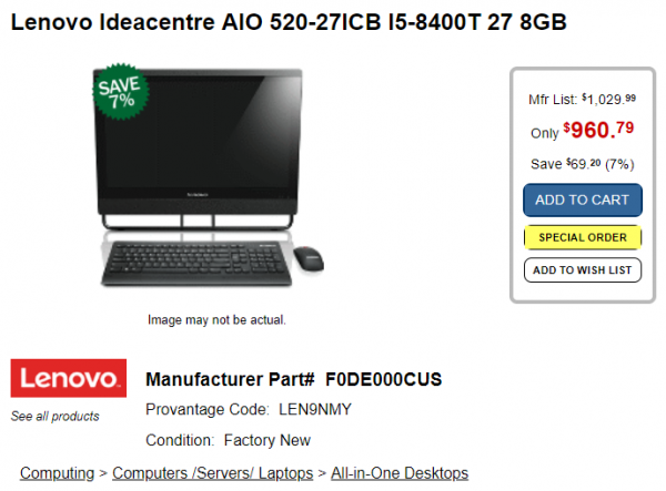 Параллельно сообщим, что Lenovo без особой огласки выпустила на рынок новые конфигурации моноблока Ideacentre AIO 520, использующие процессоры Intel Coffee Lake-S второй волны — экономичные шестиядерные Core i5-8400T и Core i7-8700T, а также четырёхъядерный Core i3-8100T. Диагональ экрана новых Ideacentre AIO варьируется от 23 до 27 дюймов, а объём оперативной памяти составляет 8 Гбайт.