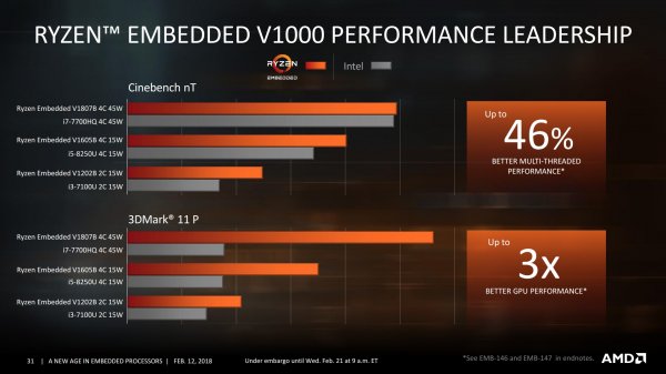Слухи об использовании в составе устройства новейшего 14-нм встраиваемого APU/SoC AMD семейства Great Horned Owl подтвердились: выбор разработчика пал на AMD Ryzen Embedded V1605B. Четыре ядра Zen в сочетании со встроенной графикой Radeon RX Vega 8 (512 потоковых процессоров GCN 5-го поколения) гораздо лучше подходят для консоли 2018 года, чем четыре 28-нм ядра (два модуля) Excavator вкупе с графическим блоком Radeon R7, оперирующим 512 потоковыми процессорами GCN 3-го поколения. Отметим, что прикладные характеристики чипа Ryzen Embedded V1605B почти полностью «позаимствованы» у APU Ryzen 5 2500U. В составе Smach Z тепловыделение последнего будет ограничено значением 15 Вт.